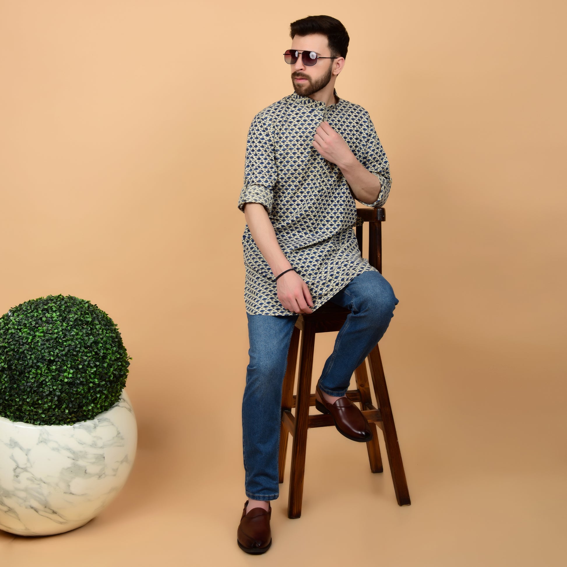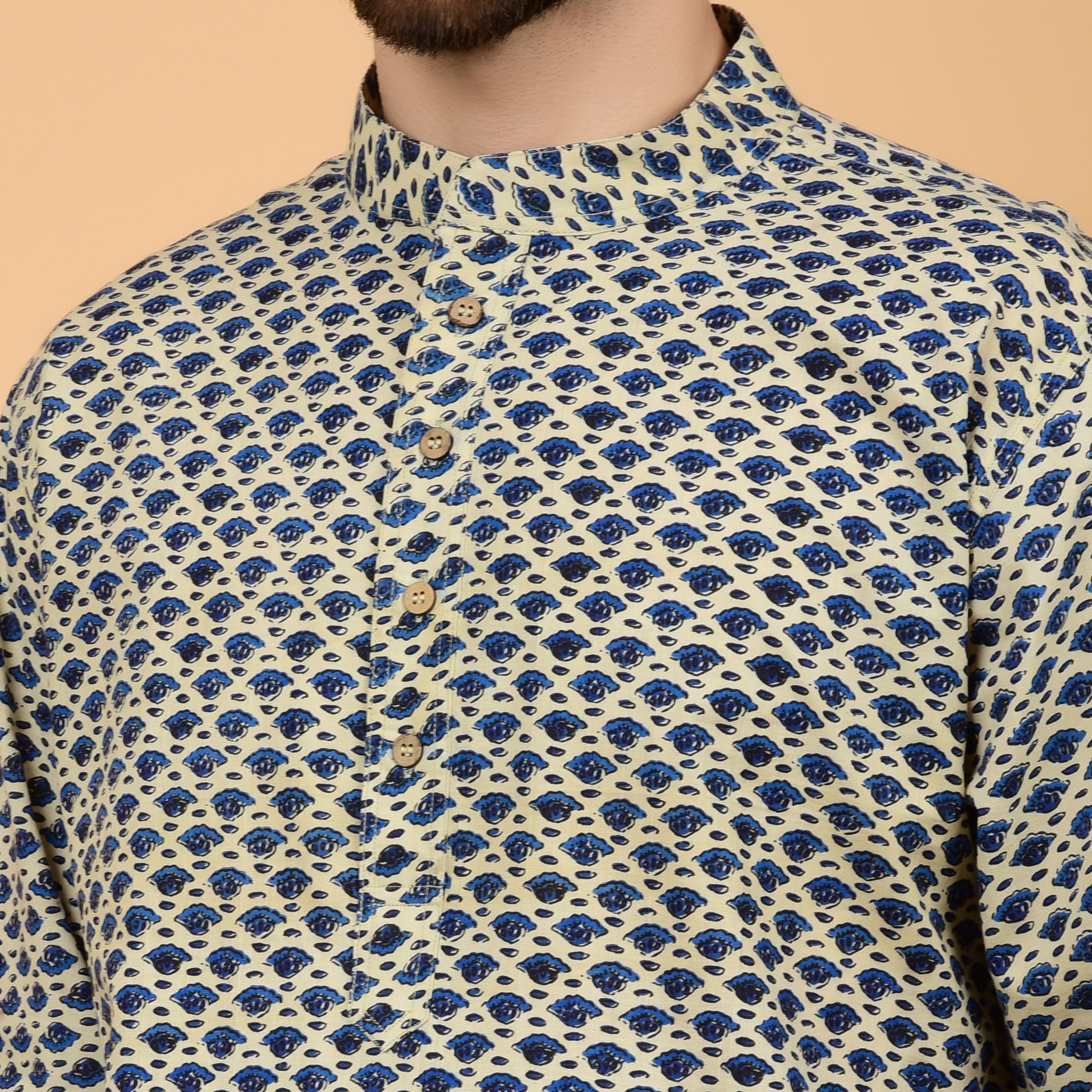 Crafted in a soft ecru base with blue hand block prints, this kurta reflects timeless craft and everyday ease. Designed with a band collar, long sleeves with cuffs, and a mid-length silhouette with round hem, it offers a relaxed yet polished profile.