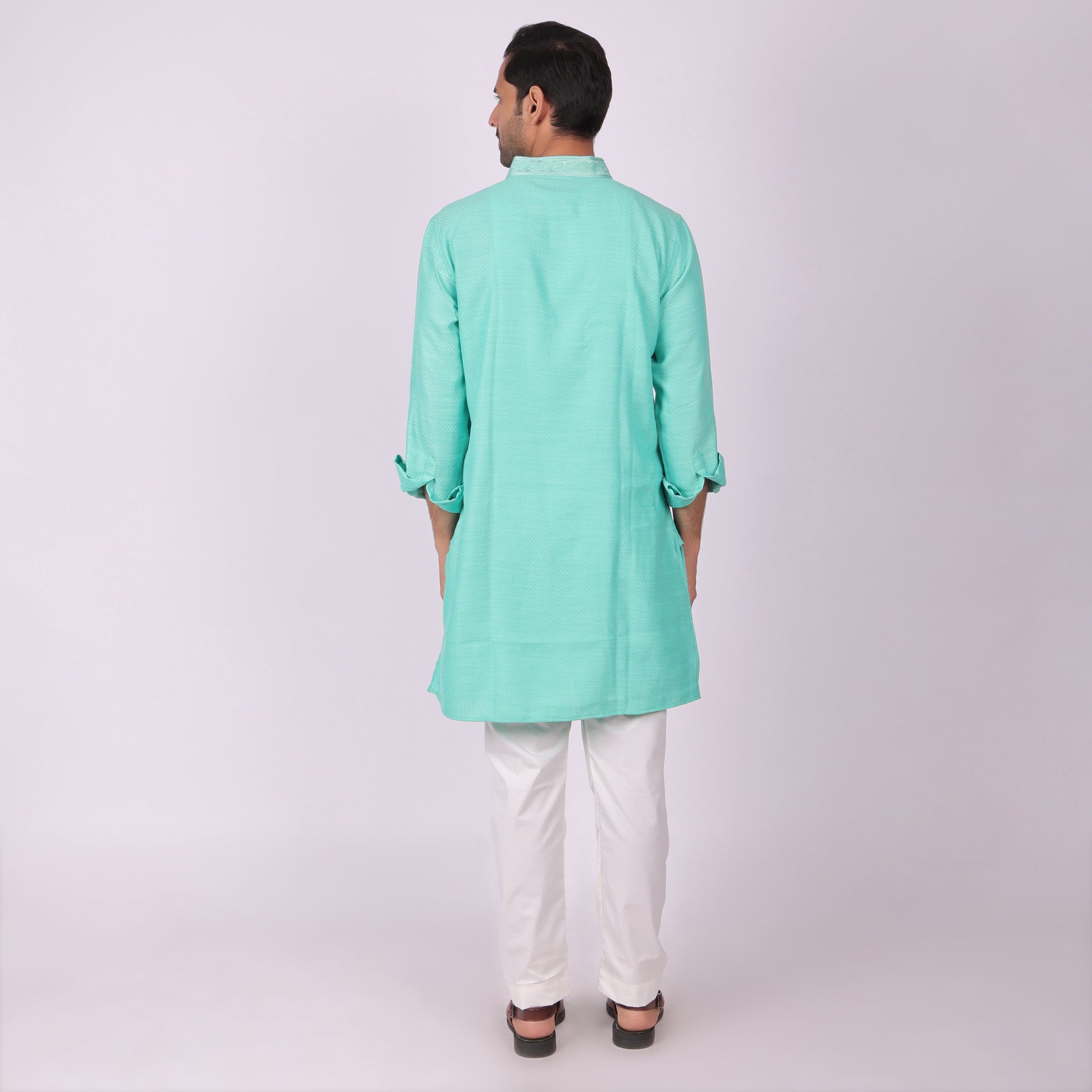 A Emerald green kurta detailed with silver embroidery on the neck band and button placket, crafted for a polished festive appearance. The subtle shine of the silver work elevates the kurta, making it ideal for weddings, festive celebrations, and evening events.
