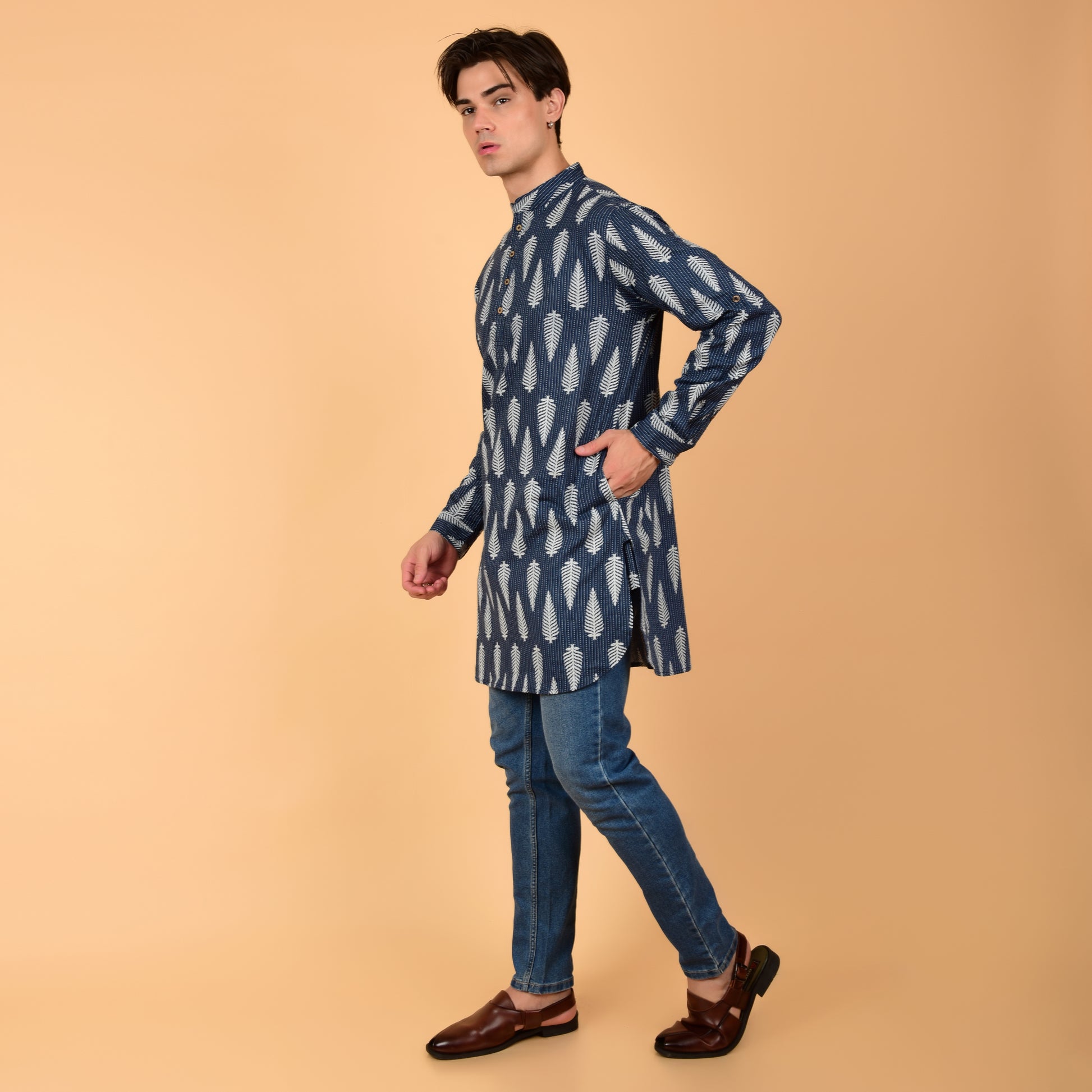 Rendered in a deep navy and ecru palette with subtle fern leaf all-over print, this kurta combines everyday wearability with understated sophistication. Featuring a band collar, long sleeves with cuffs, and a mid-length silhouette with round hem, it provides a relaxed yet refined fit.