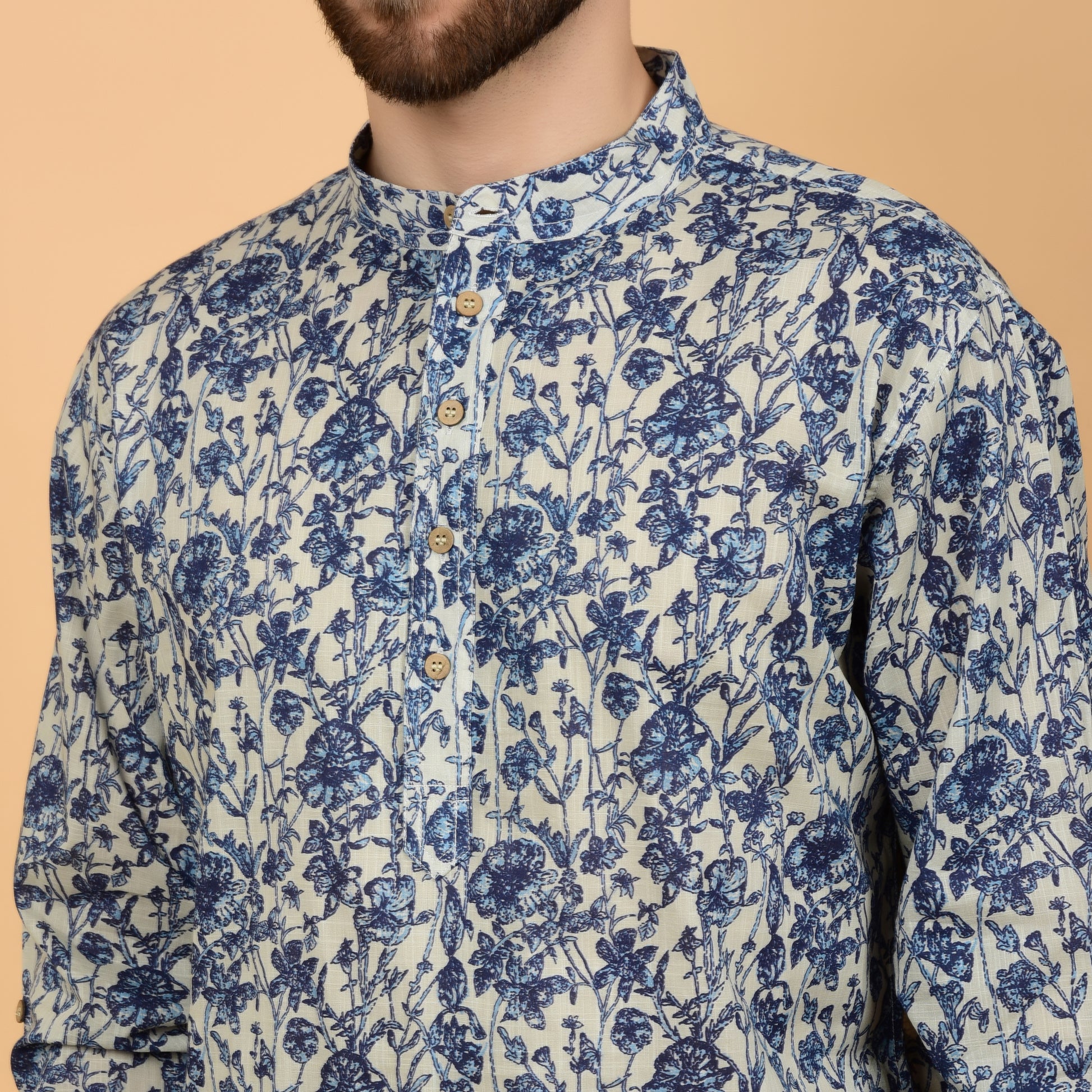 Delicately crafted in a soft ecru base with blue floral all-over print (AOP), this kurta offers a refined take on everyday comfort. Featuring a band collar, long sleeves with cuffs, and a mid-length silhouette with round hem, it blends ease and elegance seamlessly.