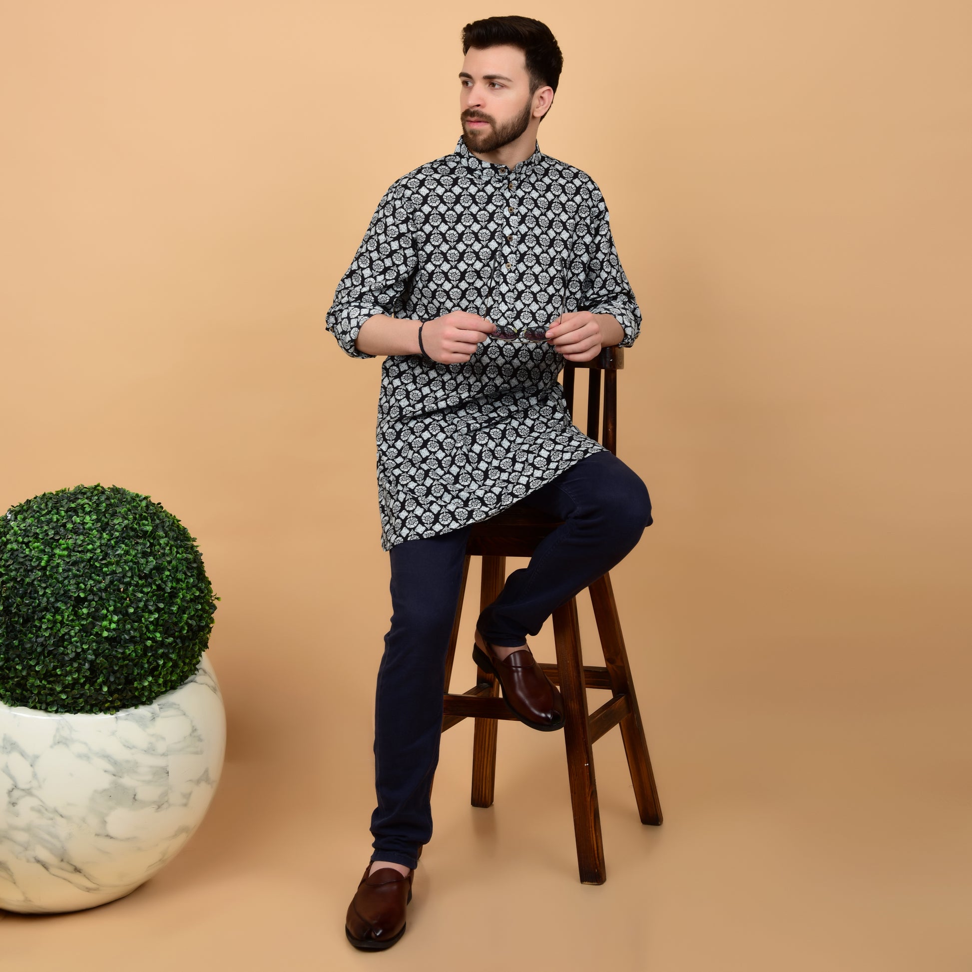Rendered in deep black, this printed kurta brings understated elegance to everyday dressing. Designed with a band collar, long sleeves with cuffs, and a mid-length cut, it balances structure with comfort.