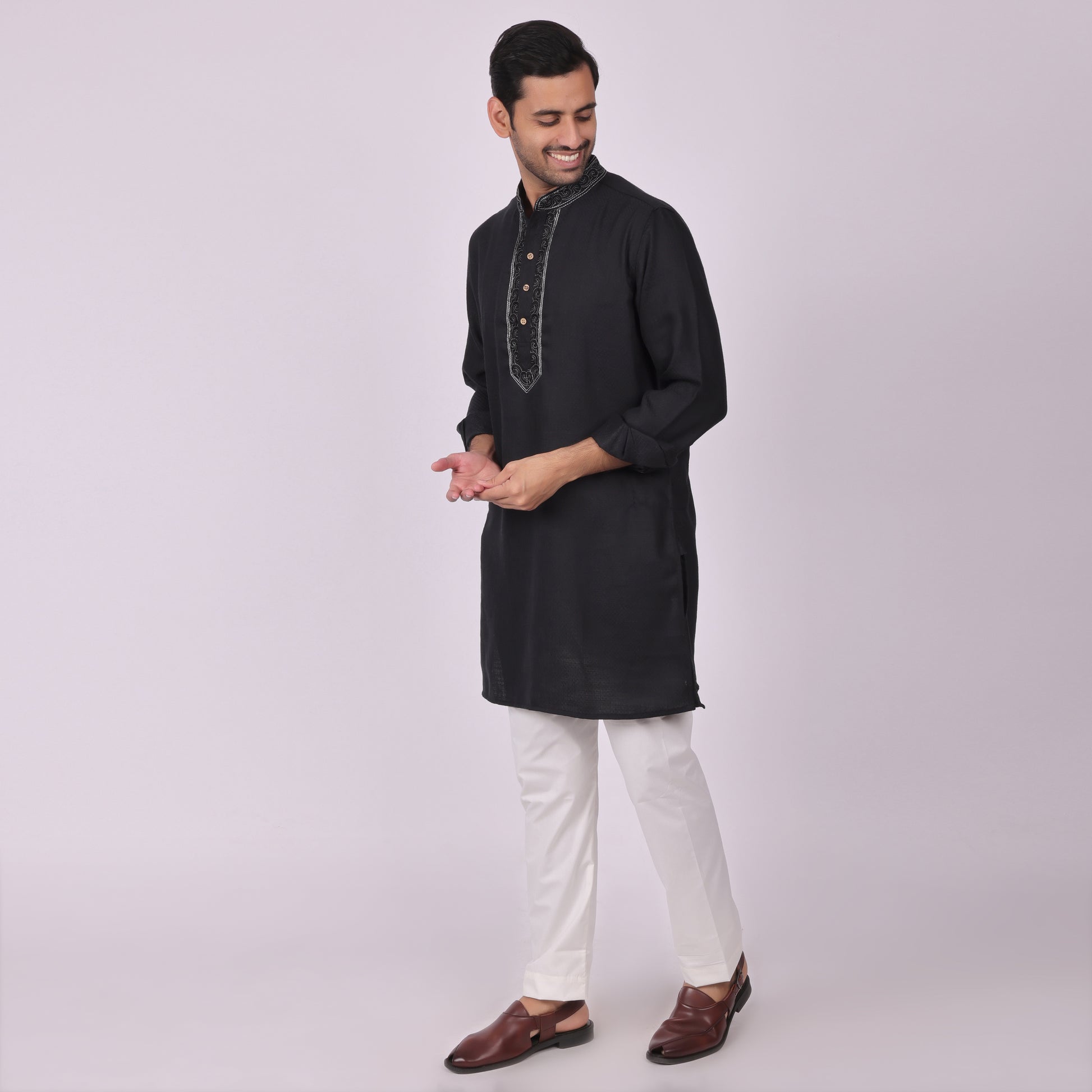 This black kurta features silver embroidery on the neck band and button placket, adding a refined festive touch to a classic colour. The contrast embroidery enhances the overall look without being overpowering, making it suitable for weddings, festive evenings, and special occasions.