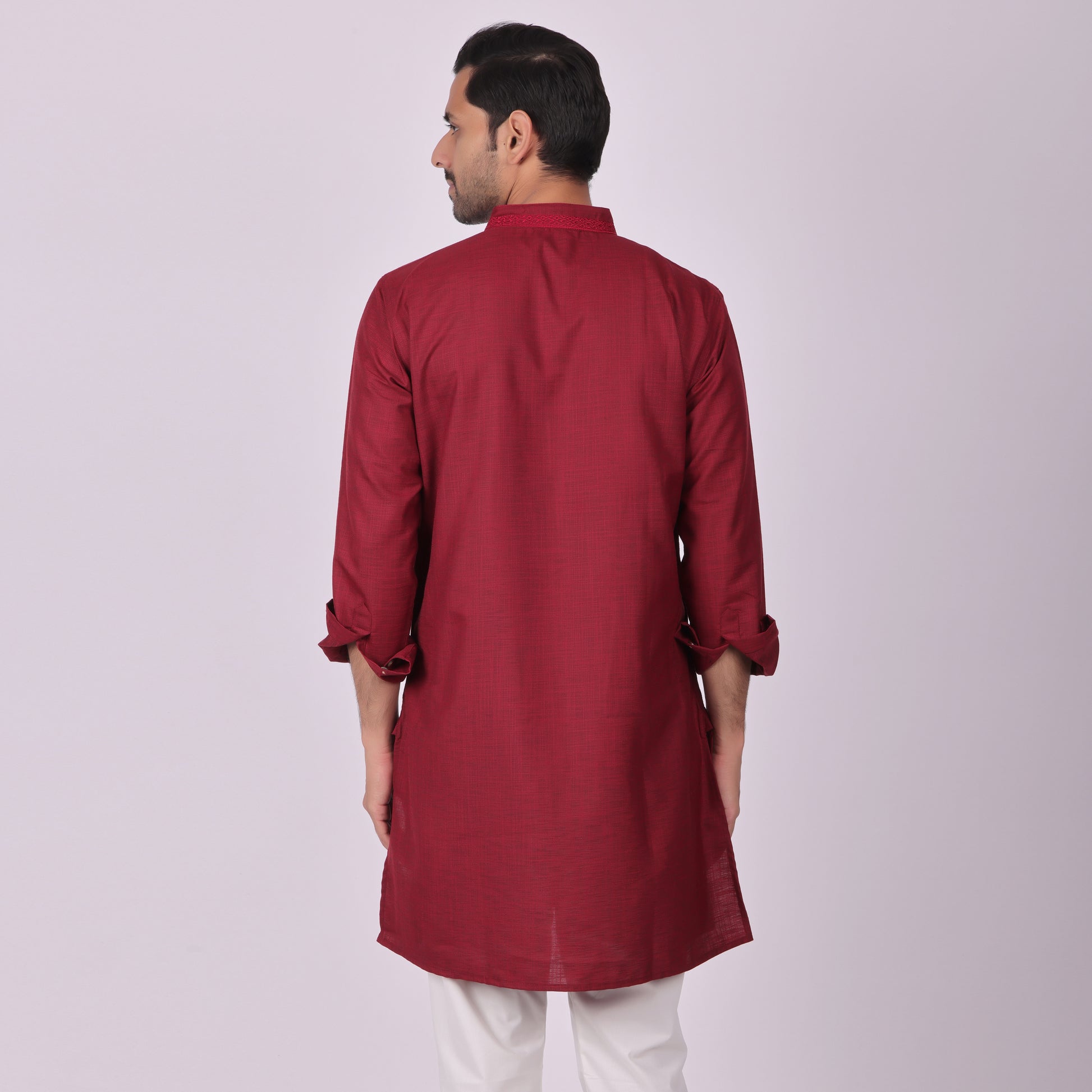 This crimson festive kurta features elegant embroidery on the neck band and button placket, adding a refined touch to its rich colour. The balanced detailing enhances the kurta’s festive appeal without overpowering the design.