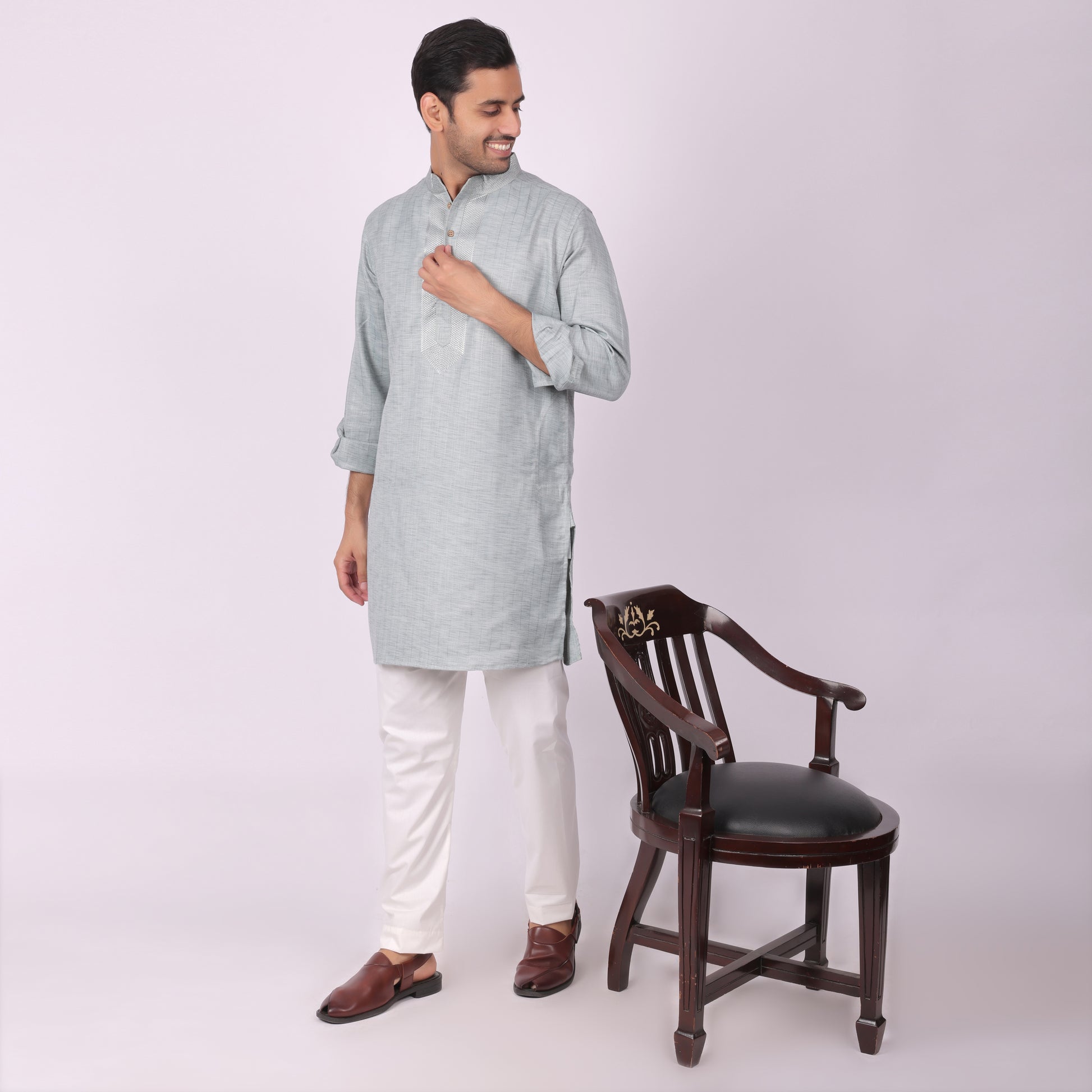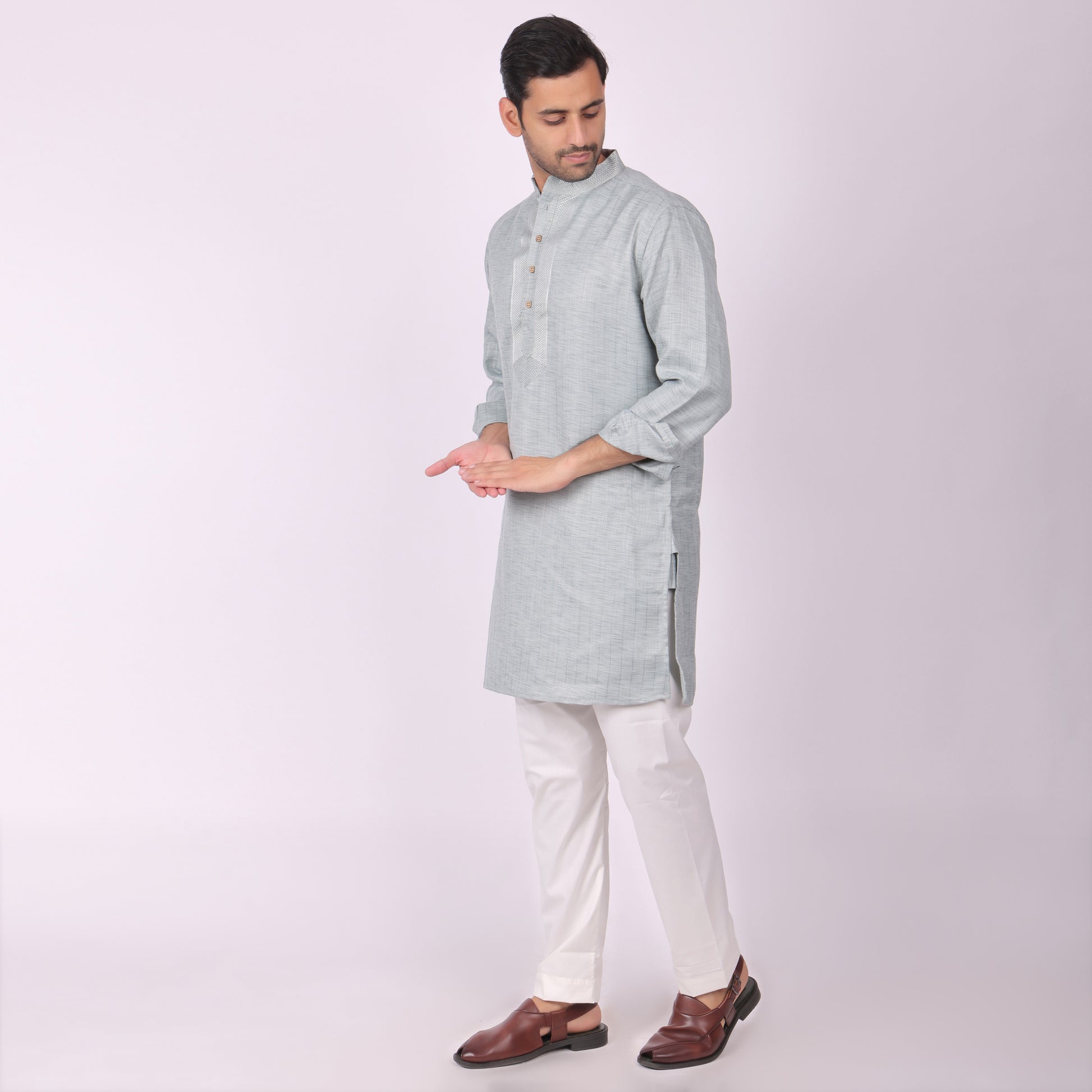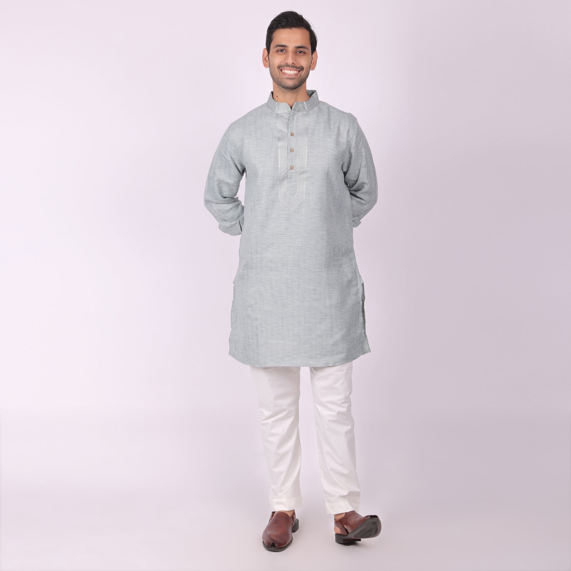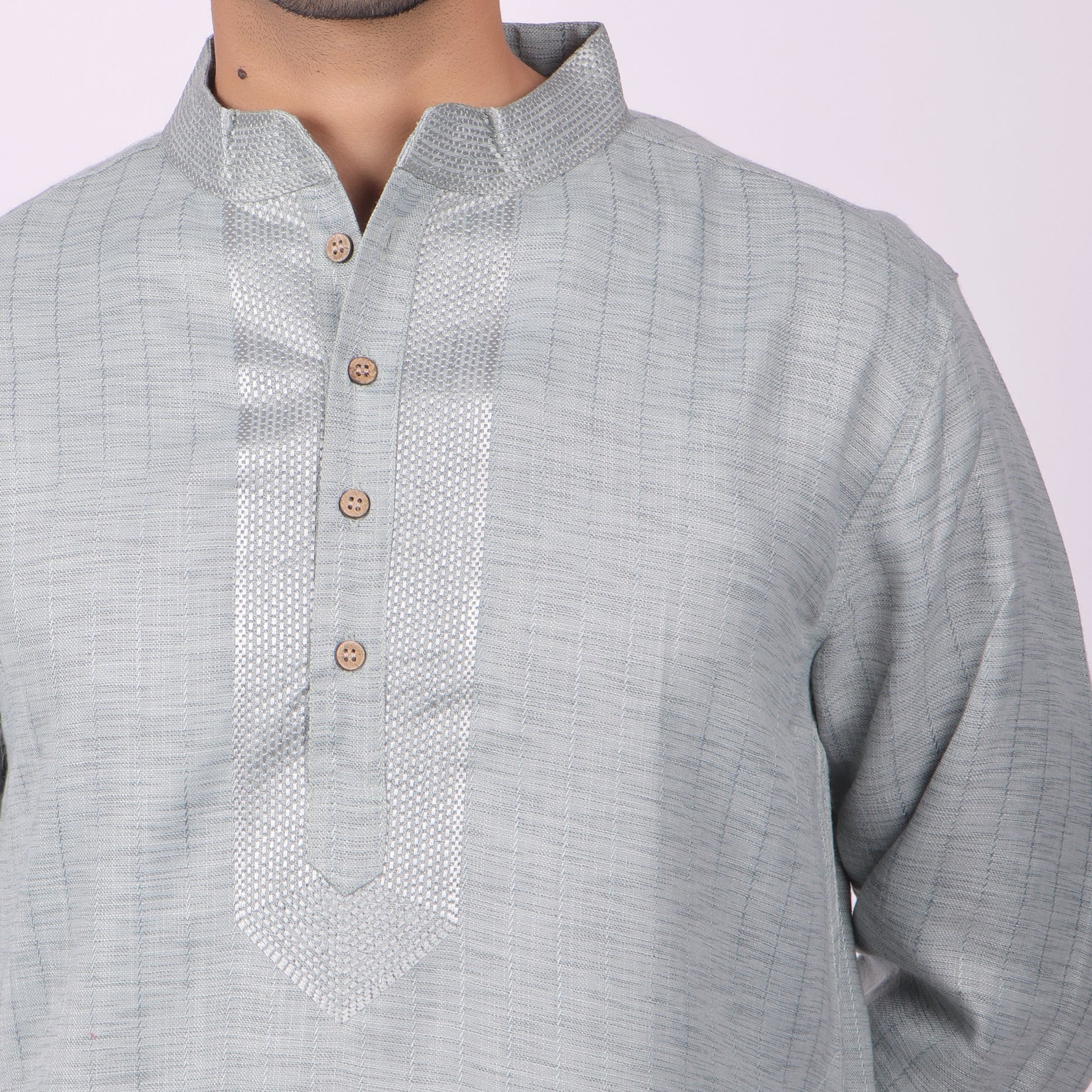 Sophisticated and striking, this silver kurta is designed for wedding evenings, receptions, and festive celebrations. Fine embroidery on the button placket and neck band adds a regal touch while keeping the look clean and contemporary.