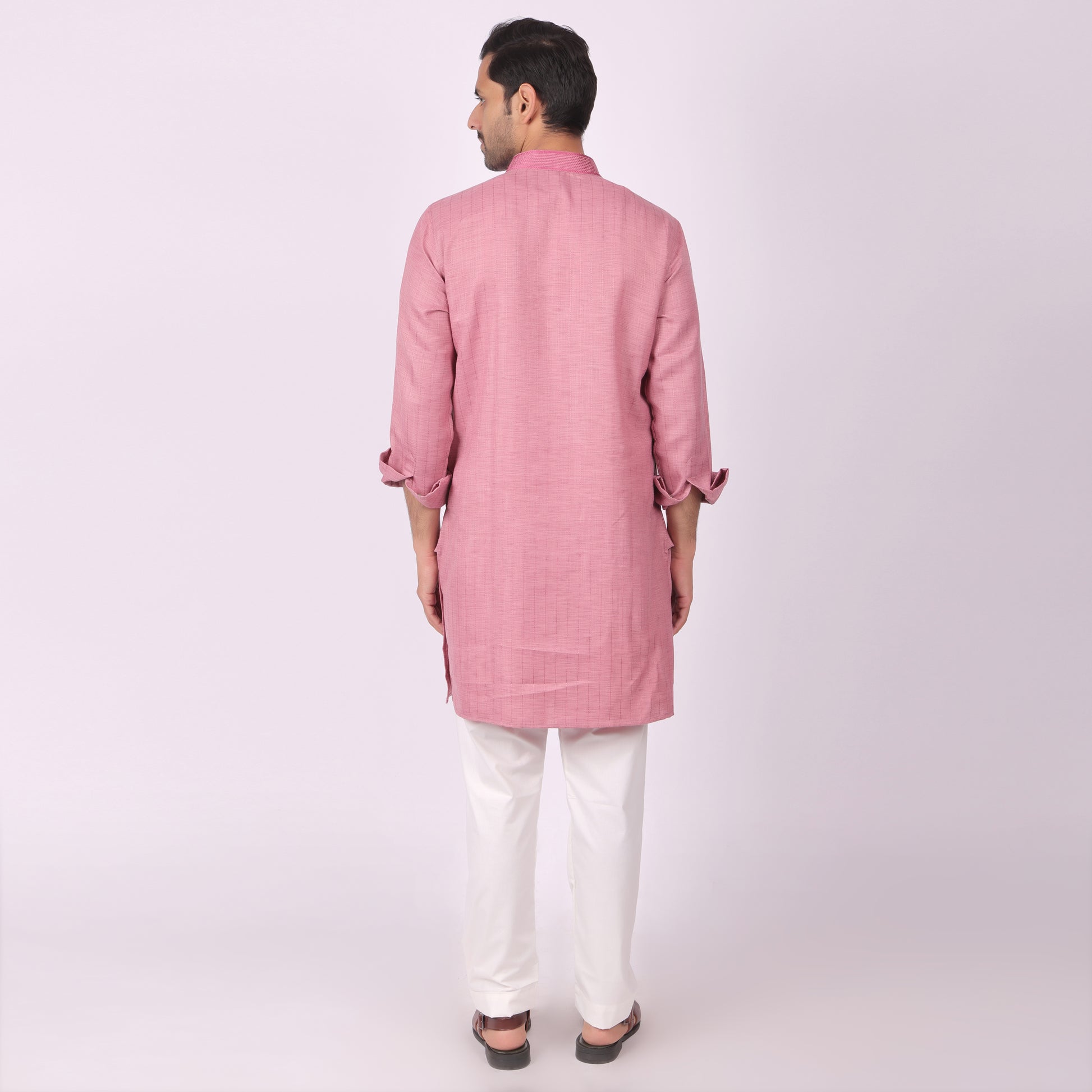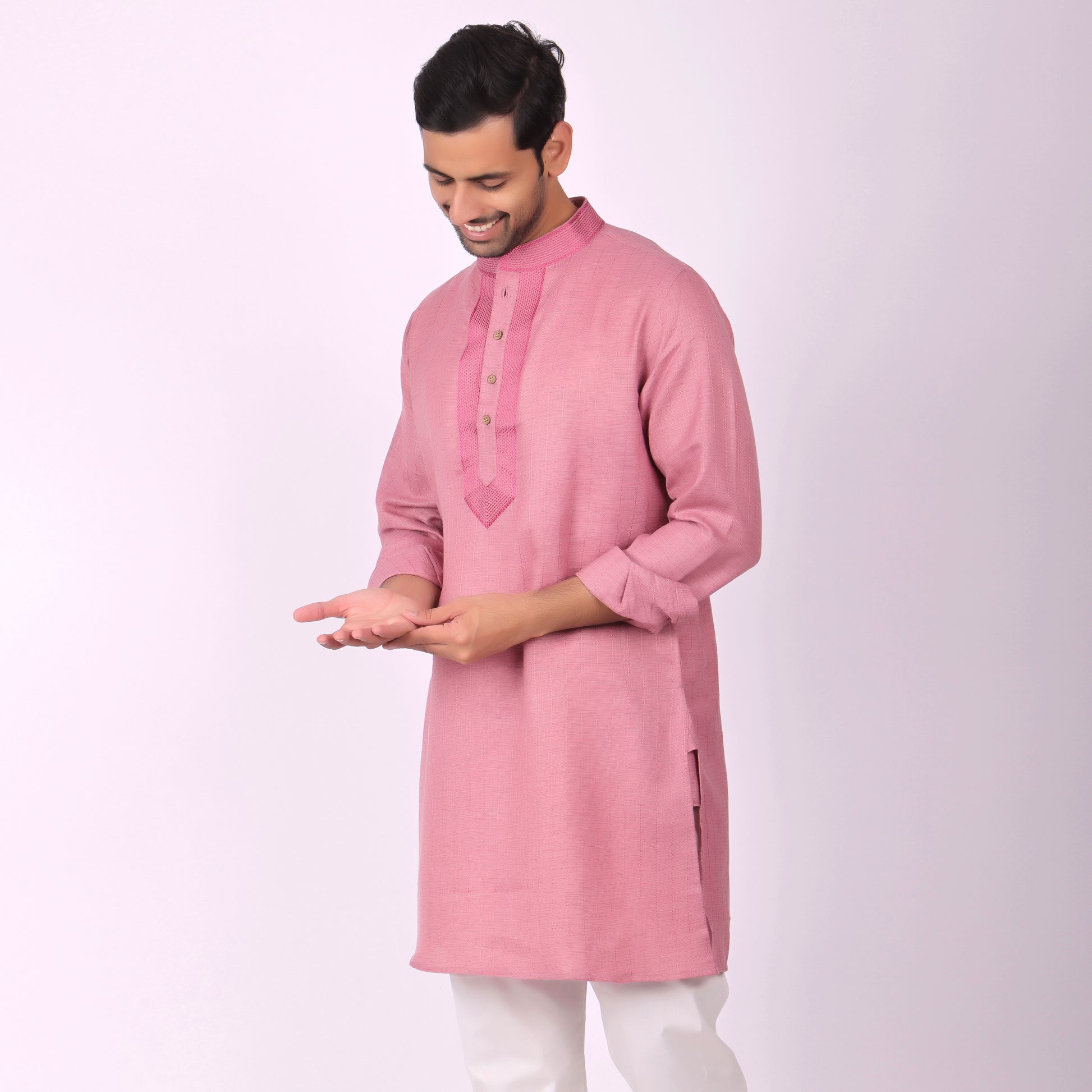 Rich yet graceful, this wine pink kurta blends celebration with elegance. The detailed embroidery on the button placket and neck band enhances its festive character, making it perfect for weddings, evening celebrations, and special occasions.